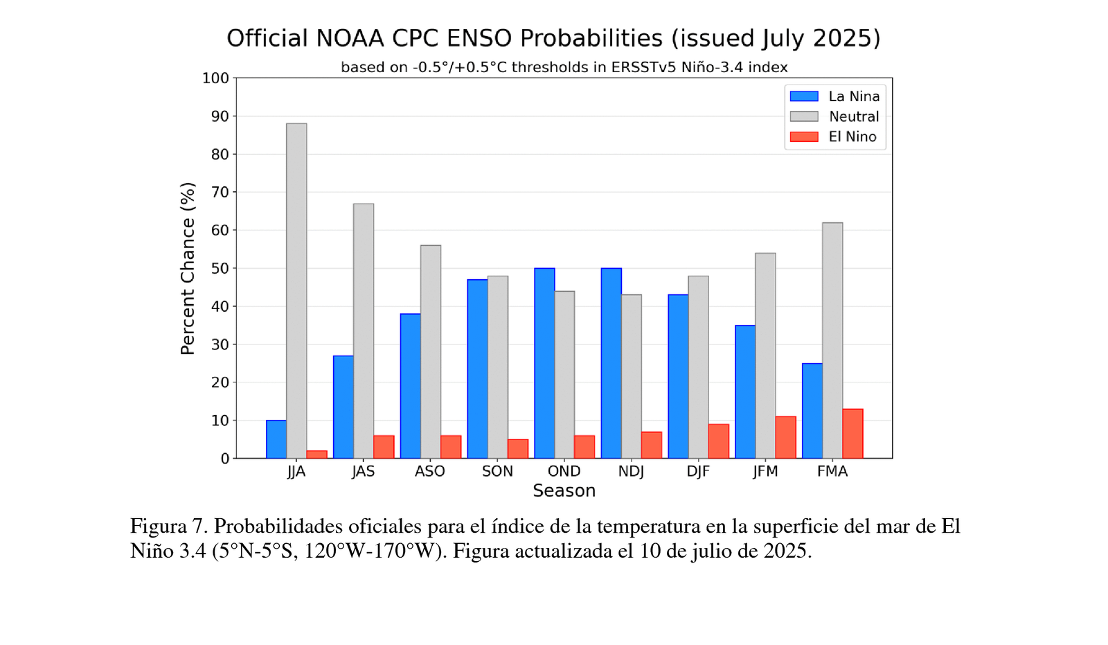 En el gráfico se aprecia el ENSO de julio, con paridades de NIÑA neutralidad en la primavera y mayor probabilidad de neutralidad en el verano.