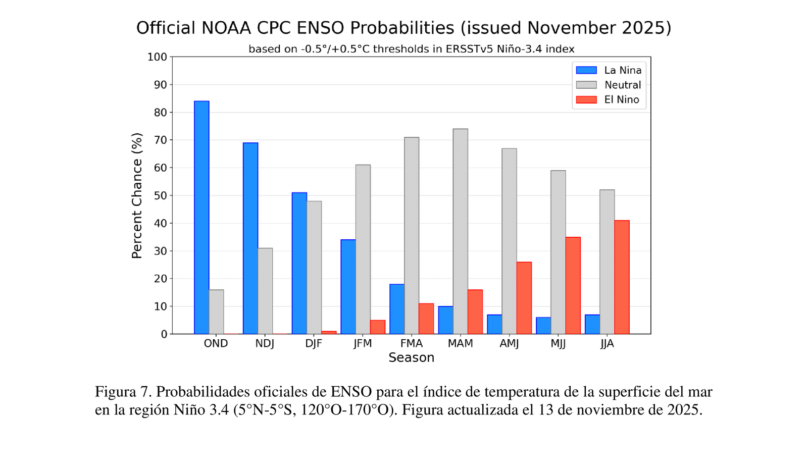 En el gráfico de abajo se ve que se igualan las posibilidades de NIÑA y Neutralidad, para los meses de diciembre enero y febrero.